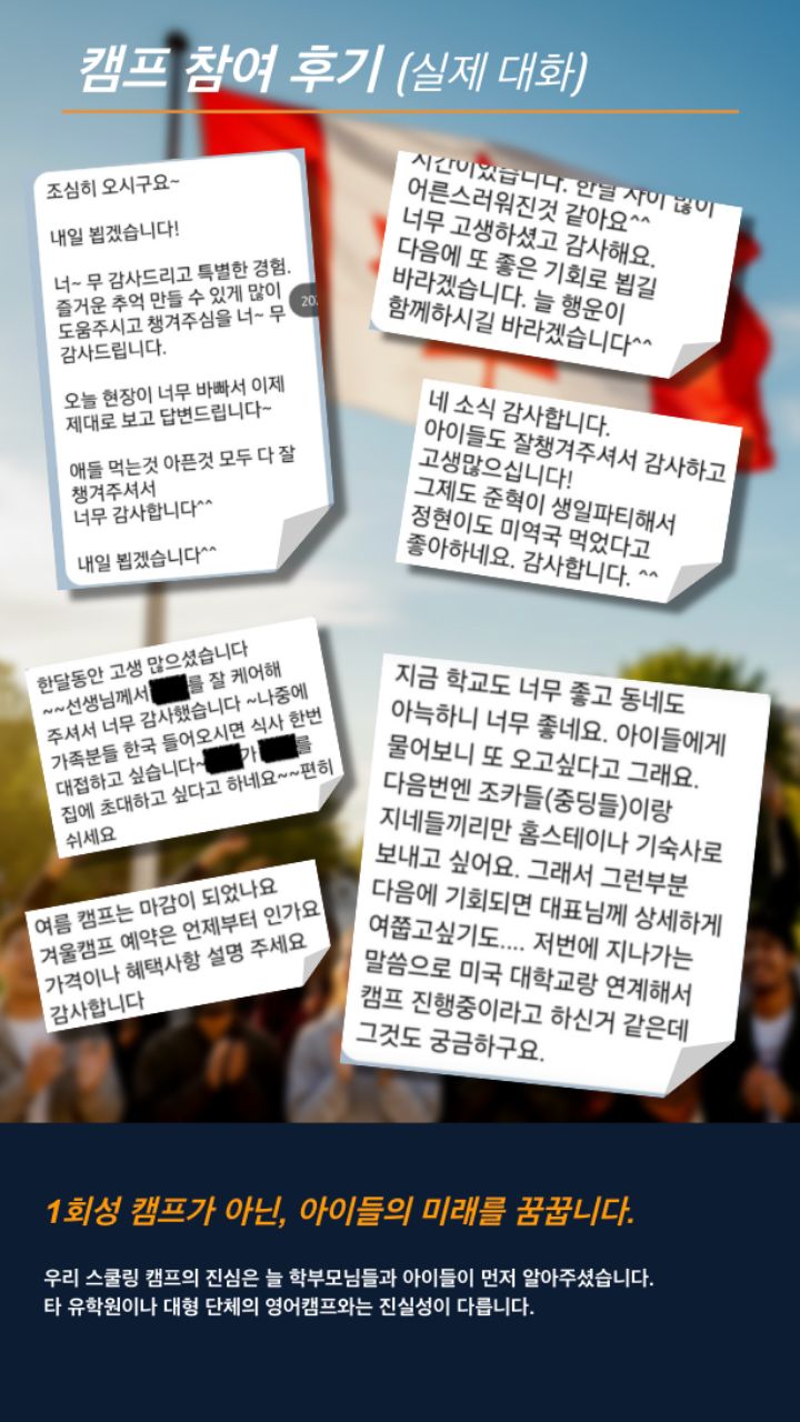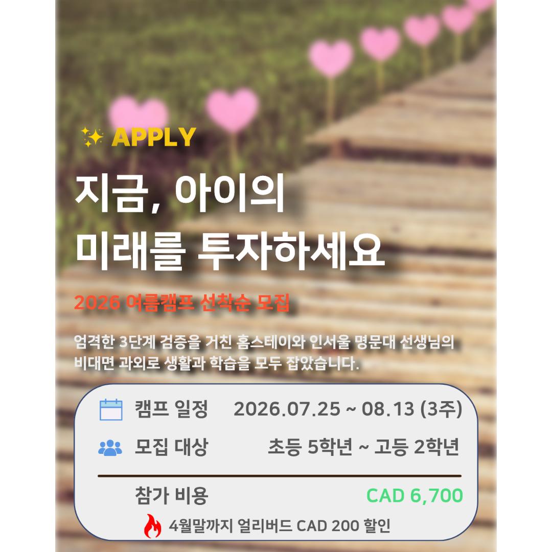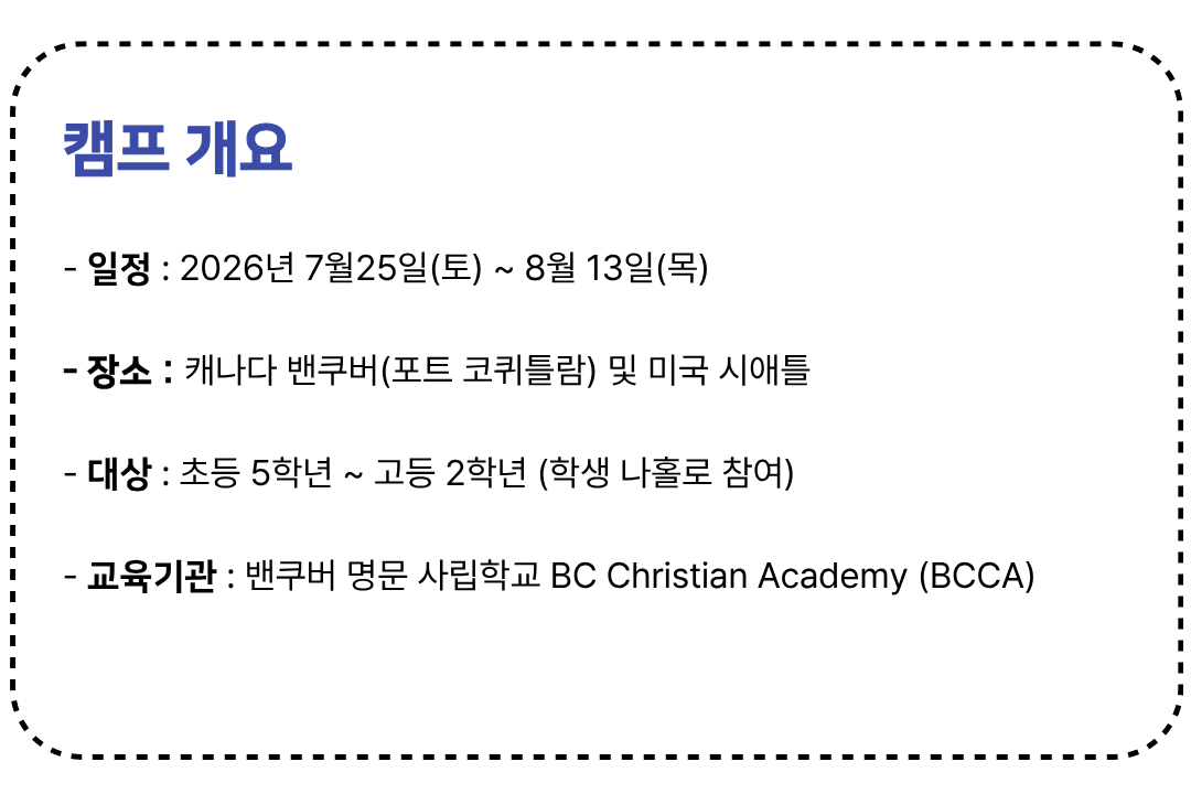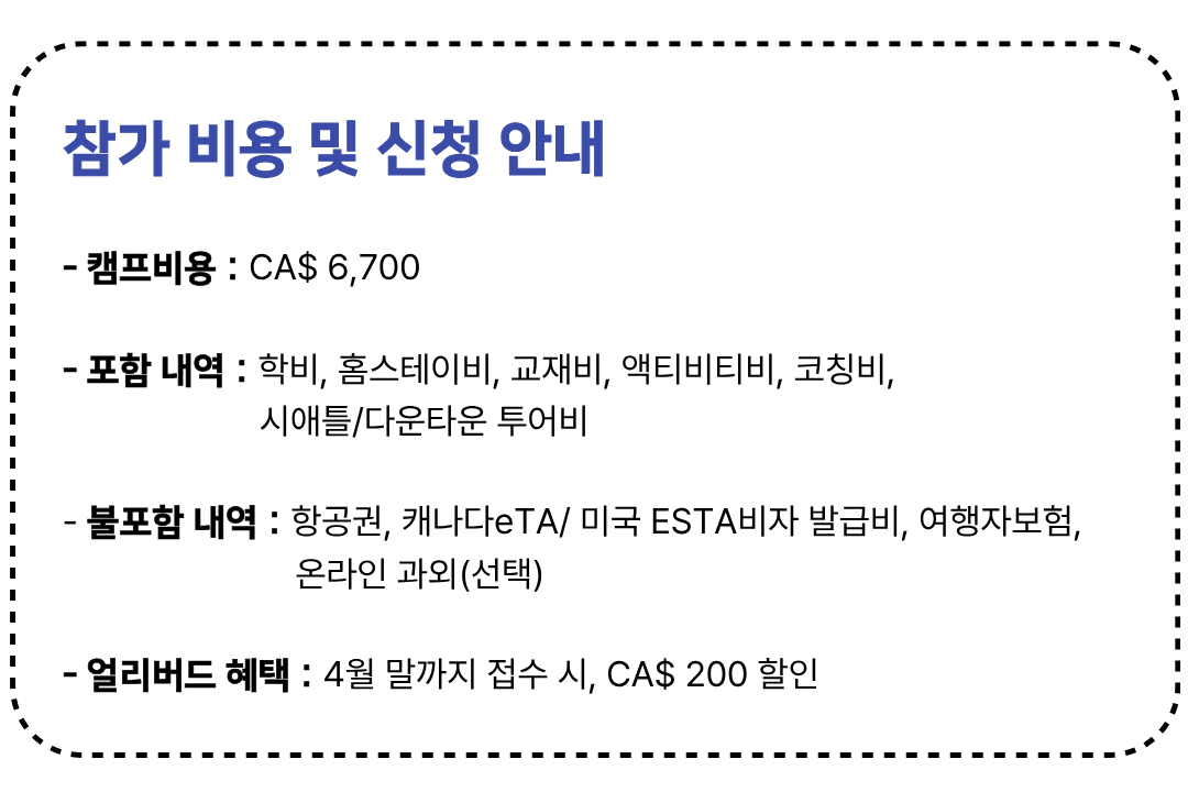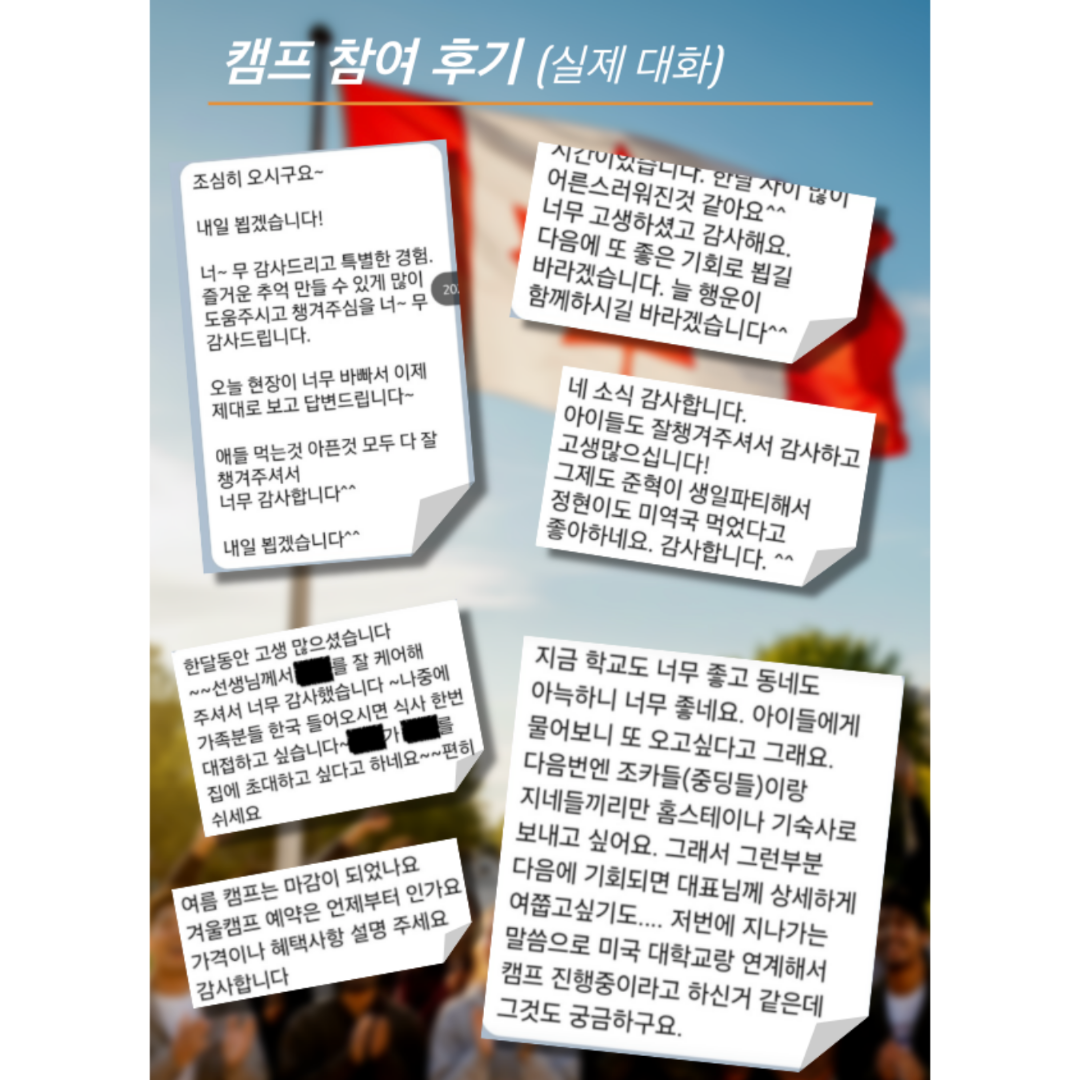 - 중도 퇴소 : 캠프 참여 중 학생의 개인 사정이나 단순 변심으로 인한 중도 퇴소 시, 잔여 일정에 대한 환불은 불가합니다.